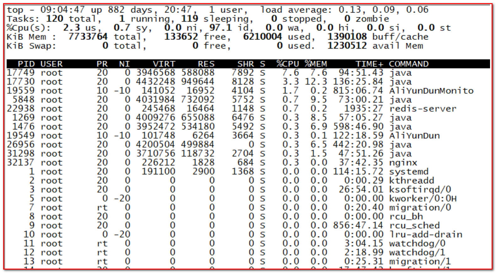 - 查看系统资源使用情况: 检查内存、磁盘、网络等资源的使用情况,因为资源竞争也可能导致CPU 飙高。特别注意内存的使用情况,过多的交换(swap)可能会导致 CPU 使用率升高。