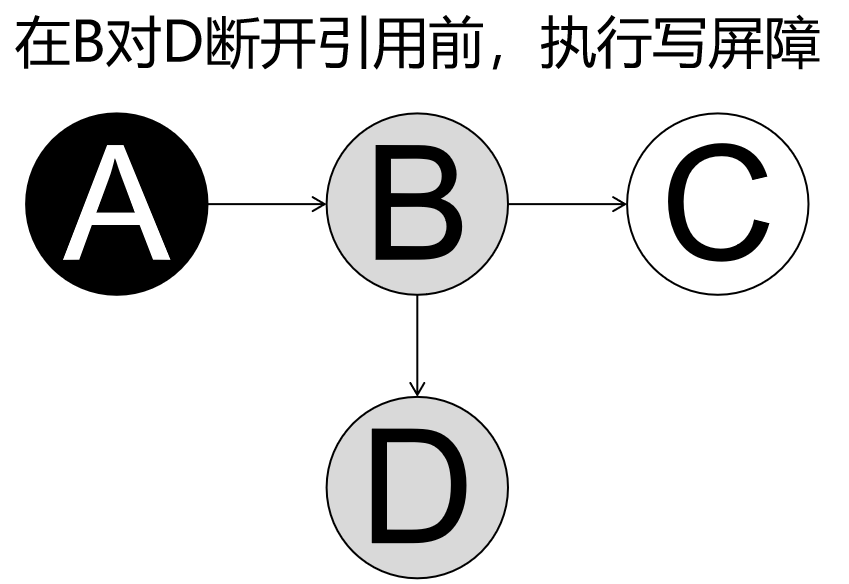 这一方案用大白话描述就是:灰色对象和一个白色对象断开连接时,把这个白色对象改成灰色,进而使其在下一轮扫描时放入工作队列,从而避免被清理,,所以这个方案破坏的是第一个条件