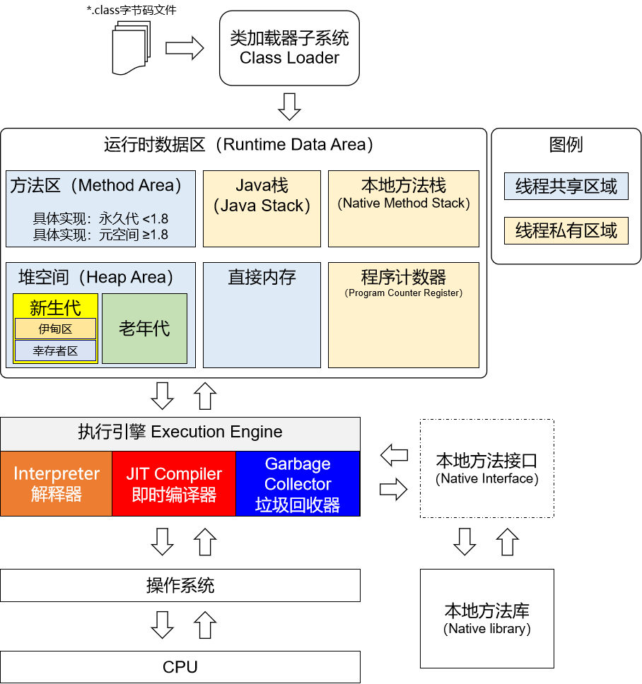 - 执行引擎(Execution Engine):也叫解释器,负责解释命令,就是将字节码指令解释/编译为当前所在平台上的本地机器指令